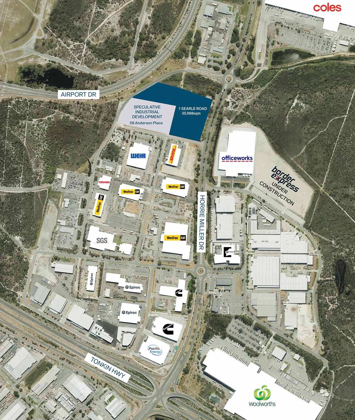 Introducing 1 Searle Road, a 35,988sqm undeveloped site with prime visibility from both Airport Drive and Horrie Miller Drive.